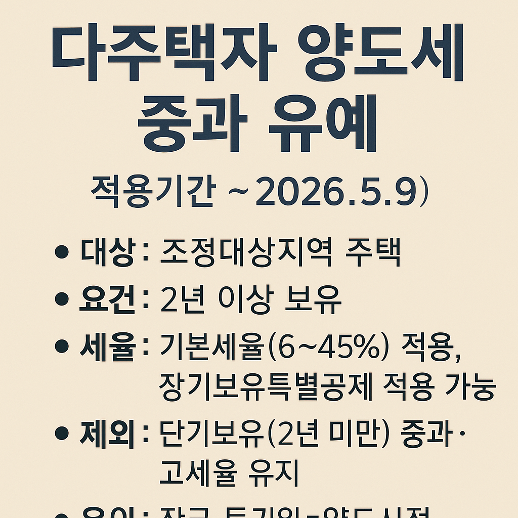 정부가 다주택자에 대한 양도세 중과(조정대상지역 내 20~30%p 가산) 유예를 2026년 5월 9일까지 1년 더 연장했다.